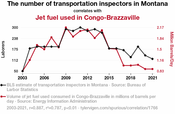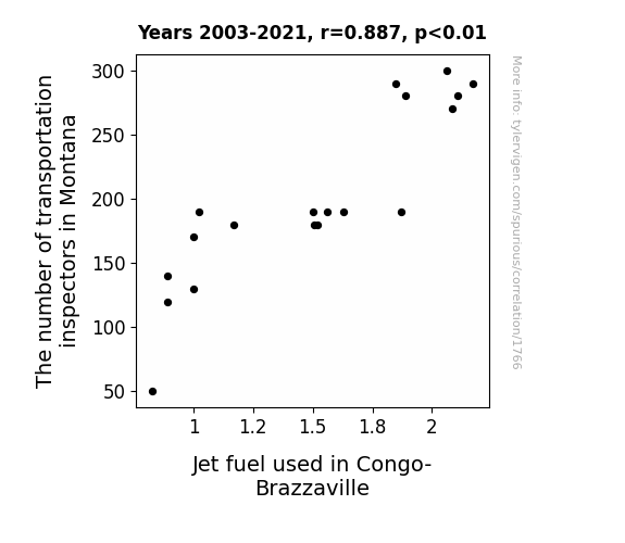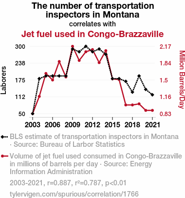 - The spurious research paper: Inspecting the Jet Set: The Curious Relationship Between Transportation Inspectors in Montana and Jet Fuel Consumption in Congo-Brazzaville