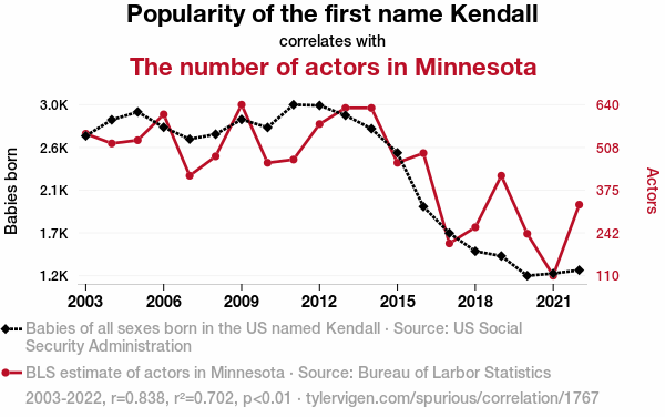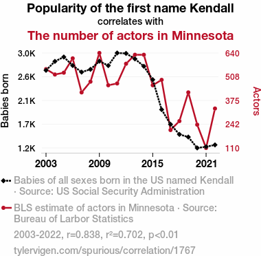 - The spurious research paper: Kendall's Kin: Correlating the Connection between the Popularity of the Name Kendall and the Population of Performers in Minnesota