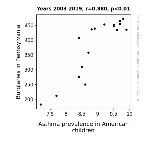 This means 77.4% of the change in the one variable (i.e., Asthma prevalence in American children) is predictable based on the change in the other (i.e., Burglaries in Pennsylvania) over the 17 years from 2003 through 2019.