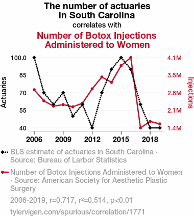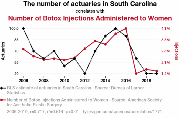 actuarial density, Botox injections, women, South Carolina, correlation, Bureau of Labor Statistics, American Society for Aesthetic Plastic Surgery, statistical analysis, correlation coefficient, p-value, socio-economic factors, neurotoxins, causation, statistical research