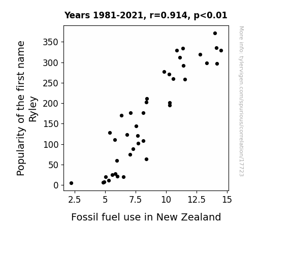 This means 83.5% of the change in the one variable (i.e., Fossil fuel use in New Zealand) is predictable based on the change in the other (i.e., Popularity of the first name Ryley) over the 41 years from 1981 through 2021.