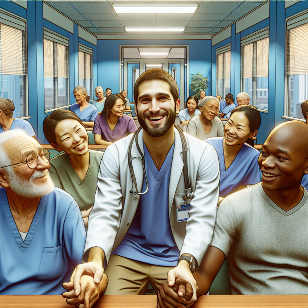 ChatGPT: Generate an image of a bustling Minnesota hospital setting with a friendly and popular psychiatric aide named "Jamison." Patients are seen seeking out his support and care, creating a warm and welcoming atmosphere in the facility. The scene should convey a sense of comfort and support through the interactions between Jamison and the patients, as well as the overall positive atmosphere of the hospital environment. The focus should be on the interactions and emotions, capturing the warmth and genuine connections between the psychiatric aide and the patients.