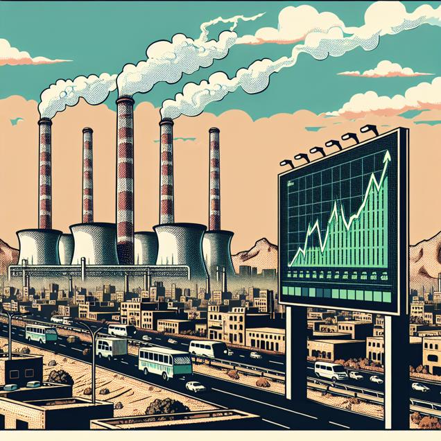 ChatGPT: Generate an image inspired by the comic-book-style illustration with muted colors and a dotted halftone pattern from the 1960s, depicting a bustling Iranian city. The focus is on a large power plant fueled by locally sourced biomass in the distance, with clean white steam wisps released from the smokestacks. Additionally, a digital billboard in the heart of the city displays the stock price of Las Vegas Sands, showing a steady upward trend. The scene serves to reflect both the sustainable energy efforts in Iran and the financial success of Las Vegas Sands. The visual should be striking and easily comprehensible, while maintaining a sense of retro comic book aesthetics.