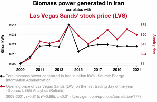 User prompt: Please provide potential search keywords for a paper titled Playing with Fire: The Biomass Boom in Iran and the High Stakes of Las Vegas Sands' Stock Price with an abstract of In this paper, we embark on a whimsical journey through the unexpected connection between the production of biomass power in Iran and the fluctuation of Las Vegas Sands' stock price. Our research brings a lighthearted touch to the serious world of economic analysis, exploring the impacts of seemingly unrelated factors on stock market performance. Utilizing data from the Energy Information Administration and LSEG Analytics (Refinitiv), our findings reveal a surprisingly robust correlation coefficient of 0.8151990 and a statistically significant p-value of less than 0.01 for the period spanning from 2009 to 2021. We invite readers to join us in this delightful exploration of the biomass power-LVS stock price relationship, and to consider the playful possibilities that exist within the realm of economic analysis.