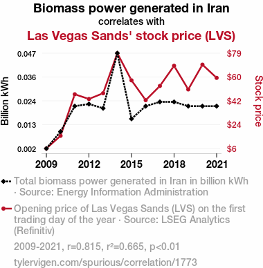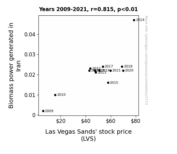 In our quest for statistical stardom, we uncovered a delightful discovery – a rambunctious relationship between the production of biomass power in Iran and the dazzling dance of Las Vegas Sands' stock price. Our data skip merrily through the years from 2009 to 2021, revealing a correlation coefficient of 0.8151990, an r-squared of 0.6645495, and a p-value of less than 0.01. It's like finding a pot of gold at the end of a data rainbow!