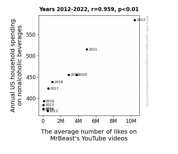 This means 91.9% of the change in the one variable (i.e., The average number of likes on MrBeast's YouTube videos) is predictable based on the change in the other (i.e., Annual US household spending on nonalcoholic beverages) over the 11 years from 2012 through 2022.