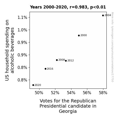 This means 96.7% of the change in the one variable (i.e., Votes for the Republican Presidential candidate in Georgia) is predictable based on the change in the other (i.e., US household spending on alcoholic beverages) over the 6 years from 2000 through 2020.