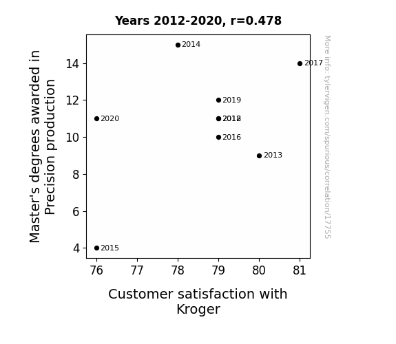 This means 22.9% of the change in the one variable (i.e., Customer satisfaction with Kroger) is predictable based on the change in the other (i.e., Master's degrees awarded in Precision production) over the 9 years from 2012 through 2020.