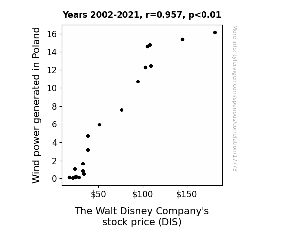 This means 91.6% of the change in the one variable (i.e., The Walt Disney Company's stock price (DIS)) is predictable based on the change in the other (i.e., Wind power generated in Poland) over the 20 years from 2002 through 2021.
