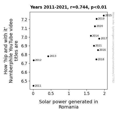 This means 55.3% of the change in the one variable (i.e., Solar power generated in Romania) is predictable based on the change in the other (i.e., How 'hip and with it' Numberphile YouTube video titles are) over the 11 years from 2011 through 2021.