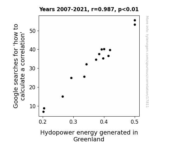 This means 97.4% of the change in the one variable (i.e., Hydopower energy generated in Greenland) is predictable based on the change in the other (i.e., Google searches for 'how to calculate a correlation') over the 15 years from 2007 through 2021.