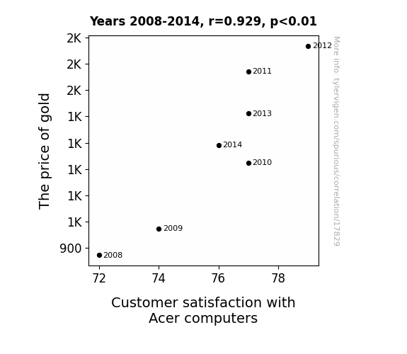 This means 86.4% of the change in the one variable (i.e., Customer satisfaction with Acer computers) is predictable based on the change in the other (i.e., The price of gold) over the 7 years from 2008 through 2014.