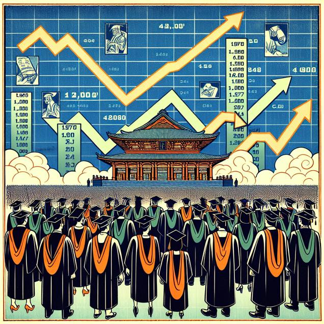 ChatGPT: Generate an image of a college graduation ceremony captured in the style of a woodblock painting. Within the scene, visualize students donning graduation gowns and holding their Associates degrees in Fine and Studio Arts. In the background, have the stock ticker displaying the McDonald's stock price rising. Emphasize the contrast between the academic achievement and the commercial success, keeping the details simple yet impactful.