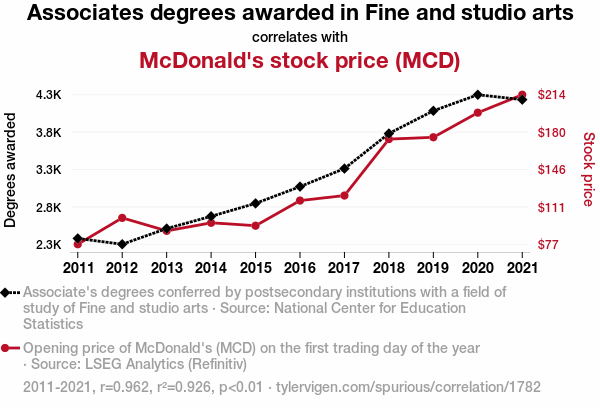 User prompt: Please provide potential search keywords for a paper titled From Canvases to Quarter Pounders: Unearthing the Link Between Fine Arts Education and McDonald's Stock Performance with an abstract of In the annals of unconventional research, our team delves into the intriguing connection between the conferral of Associate degrees in Fine and Studio Arts and the market performance of McDonald's Corporation (MCD). Leveraging data from the National Center for Education Statistics and LSEG Analytics (Refinitiv), we navigated through a landscape of creativity and capitalism to analyze trends from 2011 to 2021. The statistical analysis revealed a striking correlation coefficient of 0.9623526 and a statistically significant p-value of less than 0.01. These findings unveil a correlation that is as surprising as finding a Monet painting in a fast-food restaurant – a curious blend of artistry and the drive-thru. Our results offer a feast for thought, hinting at an interconnected world where burgers and brushstrokes may indeed dance in financial harmony.