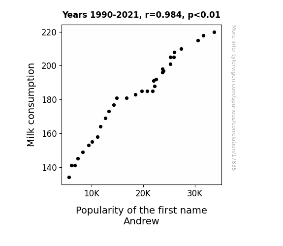 This means 96.8% of the change in the one variable (i.e., Popularity of the first name Andrew) is predictable based on the change in the other (i.e., Milk consumption) over the 32 years from 1990 through 2021.