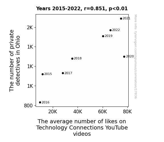 This means 72.4% of the change in the one variable (i.e., The average number of likes on Technology Connections YouTube videos) is predictable based on the change in the other (i.e., The number of private detectives in Ohio) over the 8 years from 2015 through 2022.