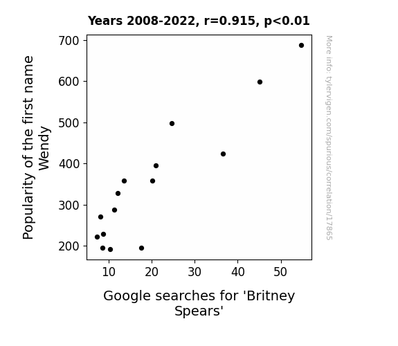 This means 83.7% of the change in the one variable (i.e., Google searches for 'Britney Spears') is predictable based on the change in the other (i.e., Popularity of the first name Wendy) over the 15 years from 2008 through 2022.