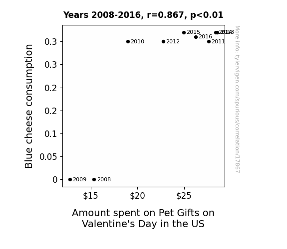This means 75.2% of the change in the one variable (i.e., Amount spent on Pet Gifts on Valentine's Day in the US) is predictable based on the change in the other (i.e., Blue cheese consumption) over the 9 years from 2008 through 2016.