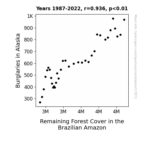 This means 87.5% of the change in the one variable (i.e., Remaining Forest Cover in the Brazilian Amazon) is predictable based on the change in the other (i.e., Burglaries in Alaska) over the 36 years from 1987 through 2022.