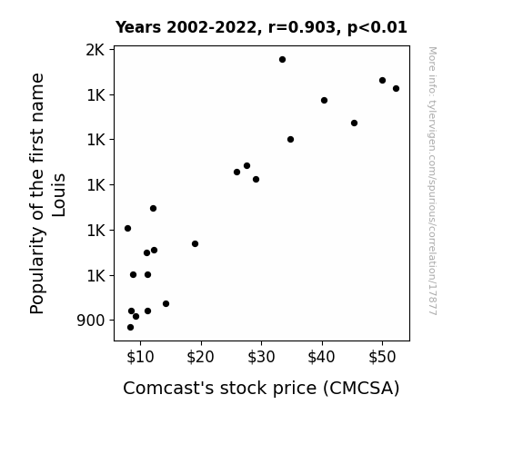 This means 81.6% of the change in the one variable (i.e., Comcast's stock price (CMCSA)) is predictable based on the change in the other (i.e., Popularity of the first name Louis) over the 21 years from 2002 through 2022.