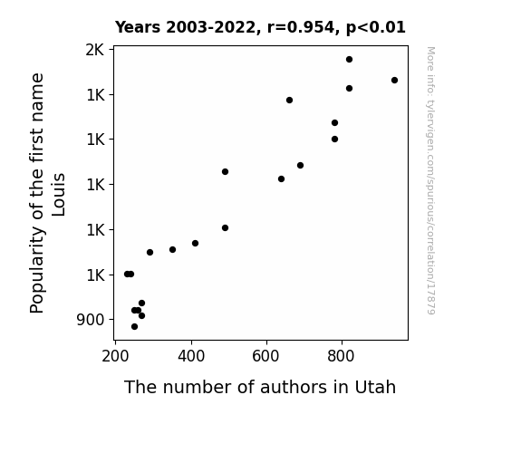 This means 91% of the change in the one variable (i.e., The number of authors in Utah) is predictable based on the change in the other (i.e., Popularity of the first name Louis) over the 20 years from 2003 through 2022.