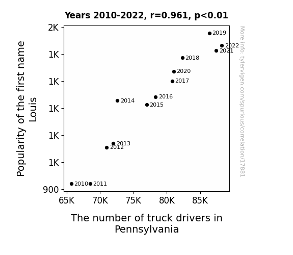 This means 92.3% of the change in the one variable (i.e., The number of truck drivers in Pennsylvania) is predictable based on the change in the other (i.e., Popularity of the first name Louis) over the 13 years from 2010 through 2022.