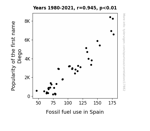 This means 89.4% of the change in the one variable (i.e., Fossil fuel use in Spain) is predictable based on the change in the other (i.e., Popularity of the first name Diego) over the 42 years from 1980 through 2021.