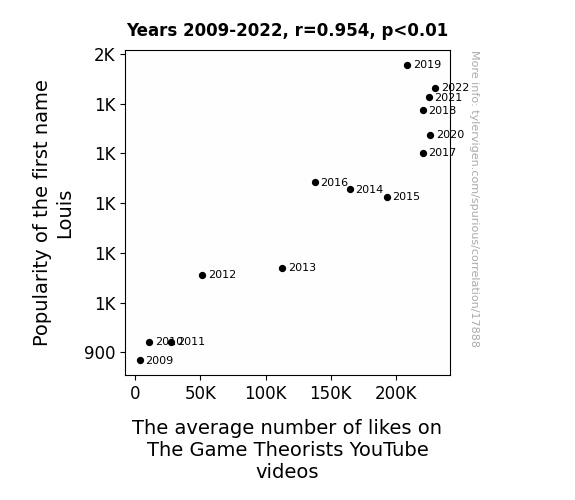 This means 90.9% of the change in the one variable (i.e., The average number of likes on The Game Theorists YouTube videos) is predictable based on the change in the other (i.e., Popularity of the first name Louis) over the 14 years from 2009 through 2022.