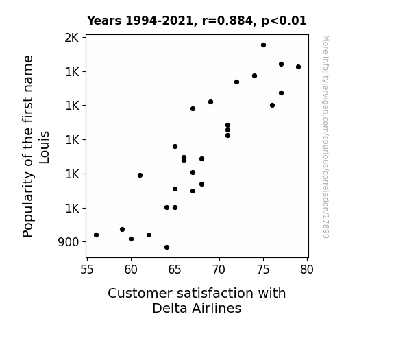 This means 78.2% of the change in the one variable (i.e., Customer satisfaction with Delta Airlines) is predictable based on the change in the other (i.e., Popularity of the first name Louis) over the 28 years from 1994 through 2021.