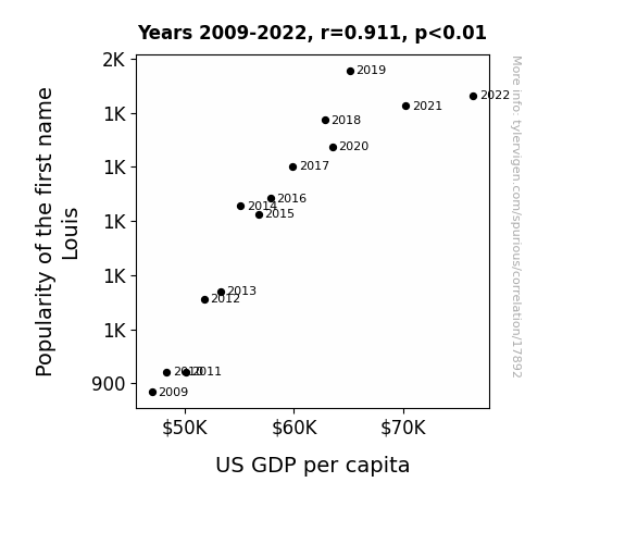 This means 83% of the change in the one variable (i.e., US GDP per capita) is predictable based on the change in the other (i.e., Popularity of the first name Louis) over the 14 years from 2009 through 2022.