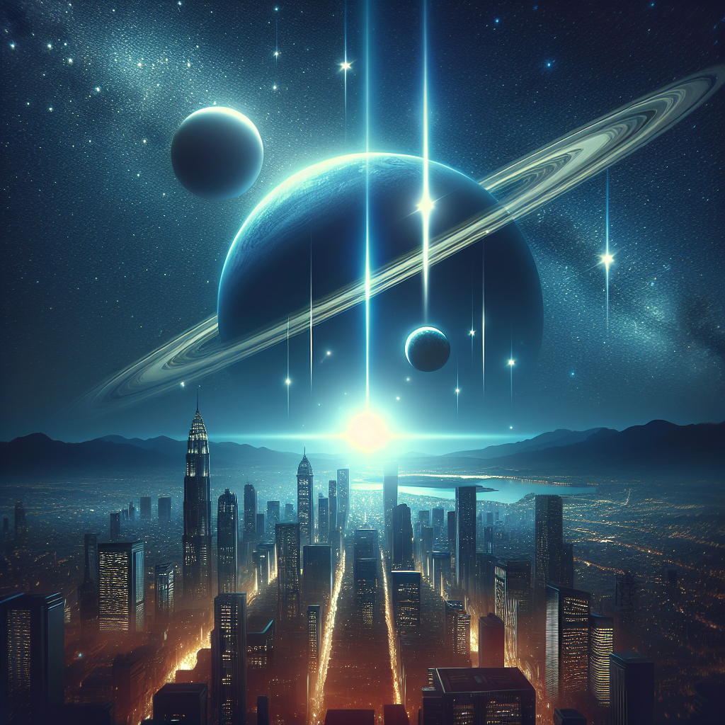 ChatGPT: [Symbolism] Create an image of a clear night sky over Washington, depicting Uranus and Saturn as bright, distant points of light. A mysterious UFO sighting is shown by a glowing, unidentified object hovering between the two planets, leaving a trail of shimmering light as it moves across the sky. The scene should evoke a sense of wonder and intrigue.