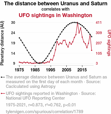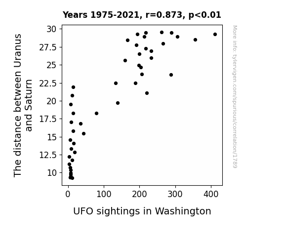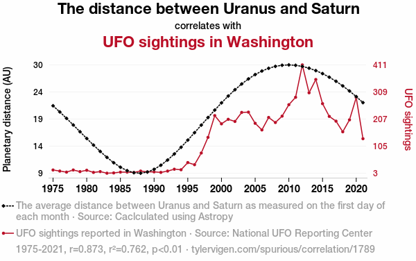 This means 76.2% of the change in the one variable (i.e., UFO sightings in Washington) is predictable based on the change in the other (i.e., The distance between Uranus and Saturn) over the 47 years from 1975 through 2021.
