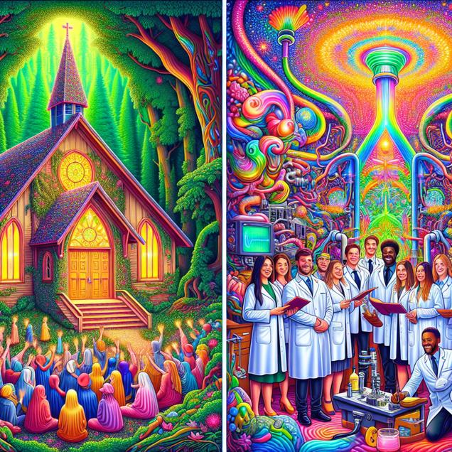 ChatGPT: Generate an image of a whimsical, psychedelic scene where a vibrant, mystical chapel is nestled within the lush Oregon forest. In the center, a group of graduates in theology and religious vocations are joyfully receiving their master's degrees, surrounded by swirling patterns and vibrant colors. Meanwhile, in another part of the state, a team of skilled medical equipment repairers are diligently working amidst psychedelic visuals to ensure that hospitals have the necessary tools to care for their patients.