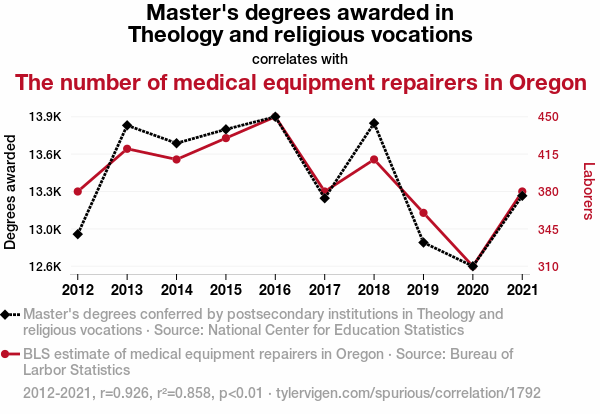 This means 85.8% of the change in the one variable (i.e., The number of medical equipment repairers in Oregon) is predictable based on the change in the other (i.e., Master's degrees awarded in Theology and religious vocations) over the 10 years from 2012 through 2021.