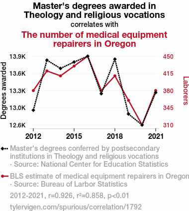 User prompt: Please provide potential search keywords for a paper titled Theology Degrees and Divine Diagnostics: Unveiling the Holy Correlation between Theological Studies and Medical Equipment Repairers in Oregon with an abstract of This research paper investigates the fascinating and perhaps divine correlation between the number of Master's degrees awarded in Theology and religious vocations and the number of medical equipment repairers in the picturesque state of Oregon. Utilizing data from the National Center for Education Statistics and the Bureau of Labor Statistics, our research team embarked on a quest to shed light on this unexpected relationship. Our findings revealed a strikingly high correlation coefficient of 0.9263033 with a statistically significant p-value of less than 0.01, spanning the years from 2012 to 2021. The implications of these findings may not only provide insight into the interconnectedness of seemingly unrelated disciplines but also offer a wholly unexpected perspective on the intersection of faith, technology, and healing. This paper challenges conventional academic boundaries while also providing a lighthearted glimpse into the unexpected and often humorous connections that exist within the fabric of statistical analyses.