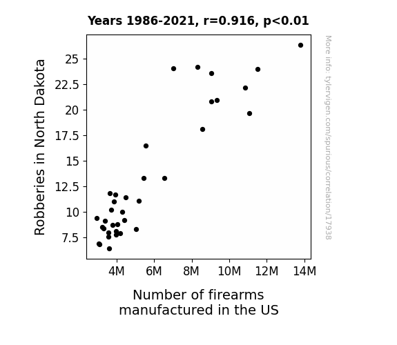 This means 83.9% of the change in the one variable (i.e., Number of firearms manufactured in the US) is predictable based on the change in the other (i.e., Robberies in North Dakota) over the 36 years from 1986 through 2021.