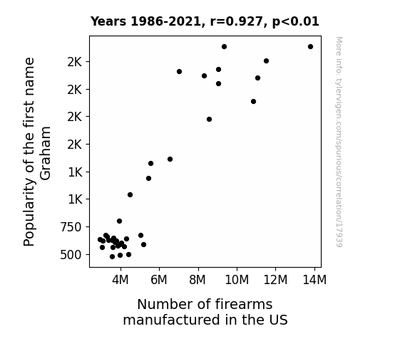 This means 85.9% of the change in the one variable (i.e., Number of firearms manufactured in the US) is predictable based on the change in the other (i.e., Popularity of the first name Graham) over the 36 years from 1986 through 2021.