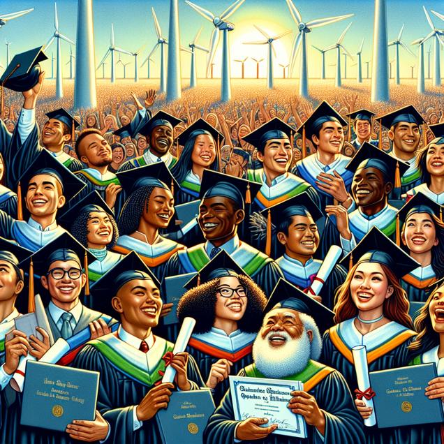 ChatGPT: A group of students proudly wearing graduation gowns and caps hold their Associate's degree in History certificates, while in the background wind turbines and solar panels generate renewable energy, symbolizing the global efforts in producing sustainable power.