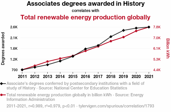 - The spurious research paper: A Historical Degree of Amped Up Energy: The Correlation Between Associates Degrees in History and Global Renewable Energy Production