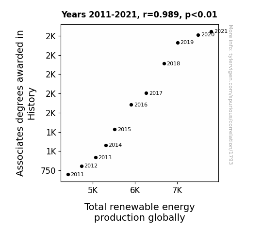 This means 97.9% of the change in the one variable (i.e., Total renewable energy production globally) is predictable based on the change in the other (i.e., Associates degrees awarded in History) over the 11 years from 2011 through 2021.