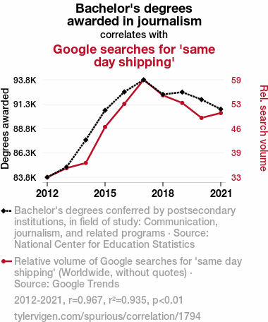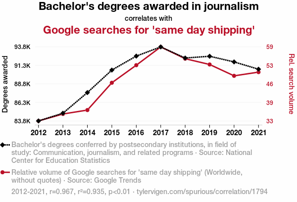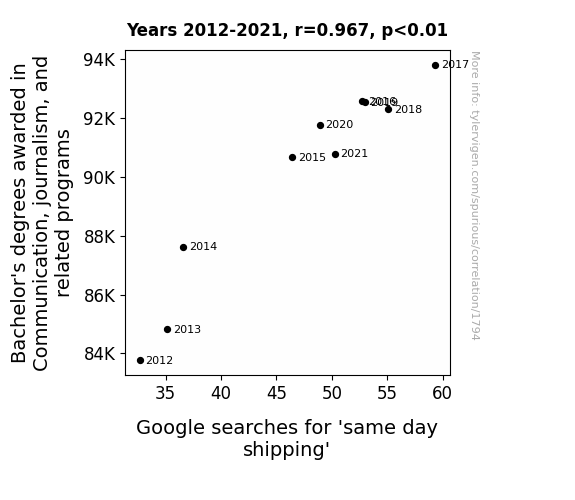 This means 93.5% of the change in the one variable (i.e., Google searches for 'same day shipping') is predictable based on the change in the other (i.e., Bachelor's degrees awarded in journalism) over the 10 years from 2012 through 2021.