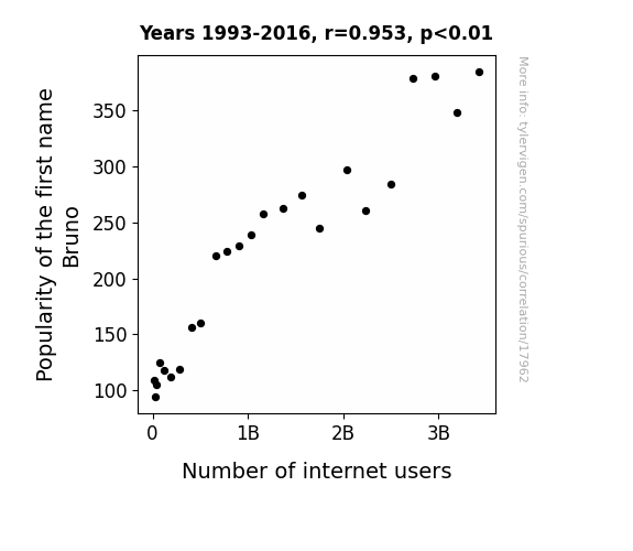 This means 90.8% of the change in the one variable (i.e., Number of internet users) is predictable based on the change in the other (i.e., Popularity of the first name Bruno) over the 24 years from 1993 through 2016.