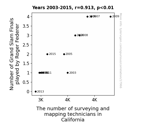 This means 83.4% of the change in the one variable (i.e., The number of surveying and mapping technicians in California) is predictable based on the change in the other (i.e., Number of Grand Slam Finals played by Roger Federer) over the 13 years from 2003 through 2015.