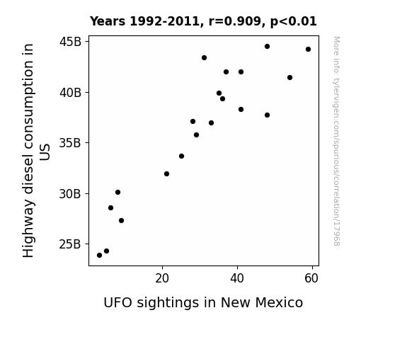 This means 82.7% of the change in the one variable (i.e., UFO sightings in New Mexico) is predictable based on the change in the other (i.e., Highway diesel consumption in US) over the 20 years from 1992 through 2011.