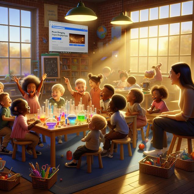 Prompt: [ Concept art ] In a warm and inviting classroom in Missouri, a preschool special education teacher sits at a small table filled with colorful science materials, eagerly engaging a group of smiling children in a hands-on experiment. The sunlight streams through the large windows, casting a warm glow on the scene. In the background, a computer screen displays a Google search for "Practical Engineering," as the teacher prepares to incorporate innovative engineering concepts into the day's lesson. The atmosphere is one of joyful learning and discovery as the children eagerly explore the world of science and engineering. The depiction should include only scenes, people, and objects, it should not include text or speech bubbles.