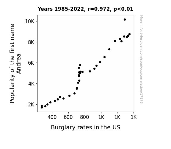 This means 94.4% of the change in the one variable (i.e., Burglary rates in the US) is predictable based on the change in the other (i.e., Popularity of the first name Andrea) over the 38 years from 1985 through 2022.