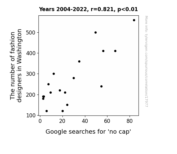 This means 67.3% of the change in the one variable (i.e., Google searches for 'no cap') is predictable based on the change in the other (i.e., The number of fashion designers in Washington) over the 19 years from 2004 through 2022.