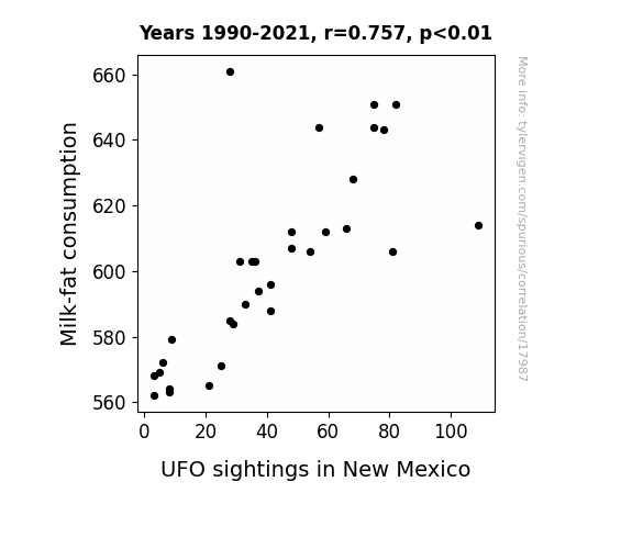 This means 57.3% of the change in the one variable (i.e., UFO sightings in New Mexico) is predictable based on the change in the other (i.e., Milk-fat consumption) over the 32 years from 1990 through 2021.