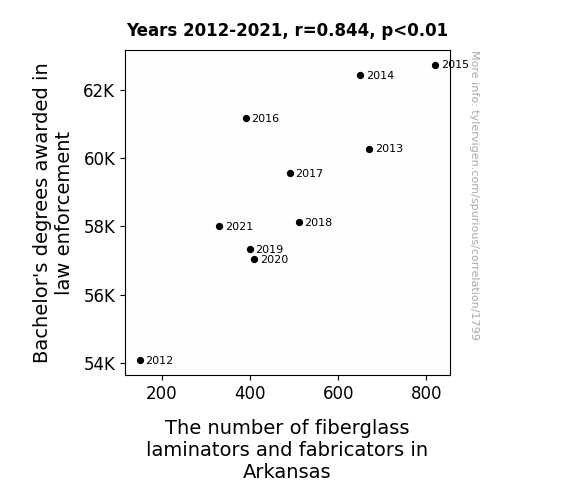 This means 71.3% of the change in the one variable (i.e., The number of fiberglass laminators and fabricators in Arkansas) is predictable based on the change in the other (i.e., Bachelor's degrees awarded in law enforcement) over the 10 years from 2012 through 2021.