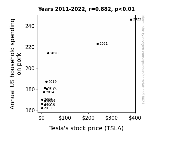 This means 77.7% of the change in the one variable (i.e., Tesla's stock price (TSLA)) is predictable based on the change in the other (i.e., Annual US household spending on pork) over the 12 years from 2011 through 2022.